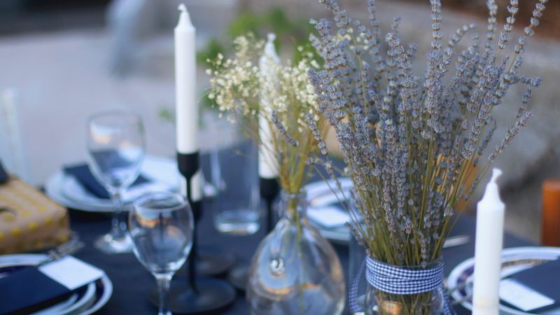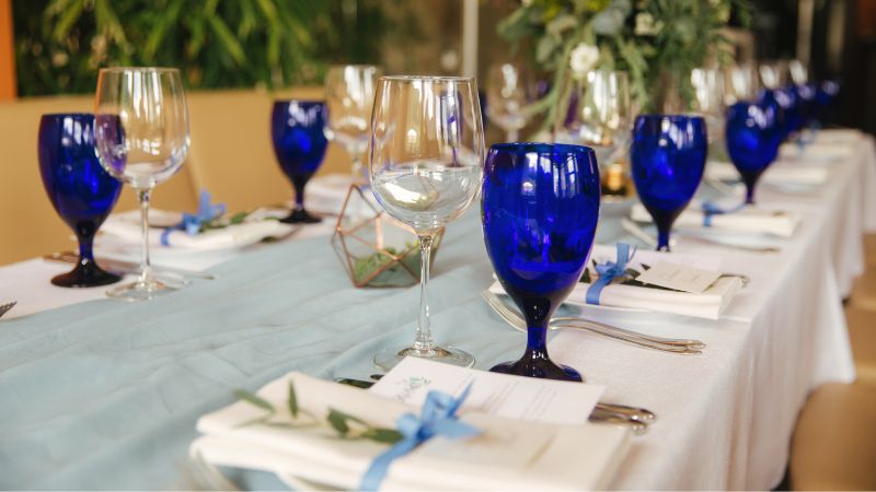 Incorporate blue glassware to elevate the table setting. Choose from options like blue tinted wine glasses or decorative blue water goblets to add a touch of sophistication and theme adherence.